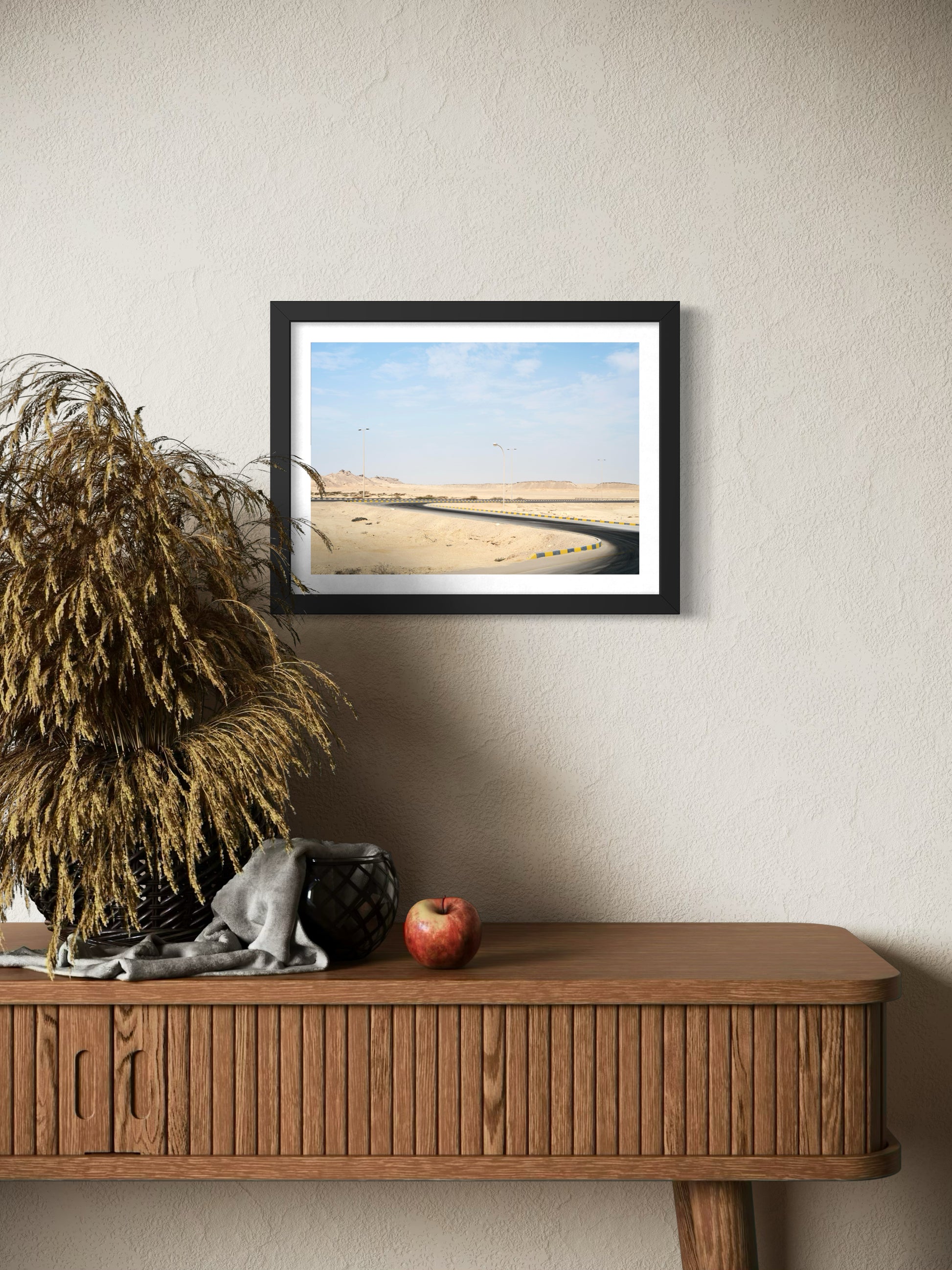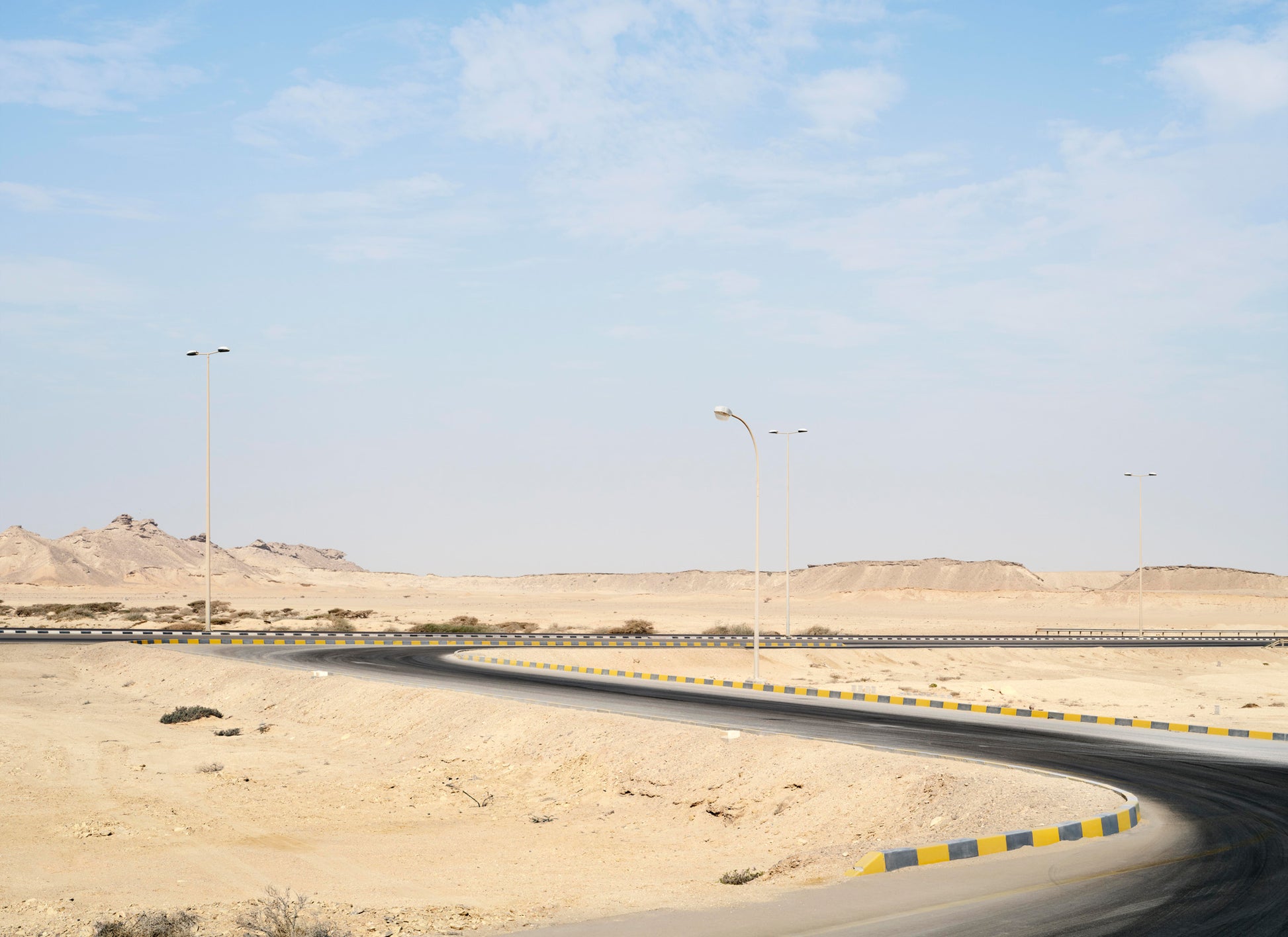 L’univers de la nature primitive, celle qui a dessiné, au long de millénaires, l’espace sableux et les collines à l’arrière-plan et l’univers humain, celui qui a tracé, en quelques mois, la route bitumeuse. Ce noir, récurrent dans la série, fait écho à la palette des vêtements des femmes d’Oman, et devient un fil visuel qui relie l’humain au paysage.