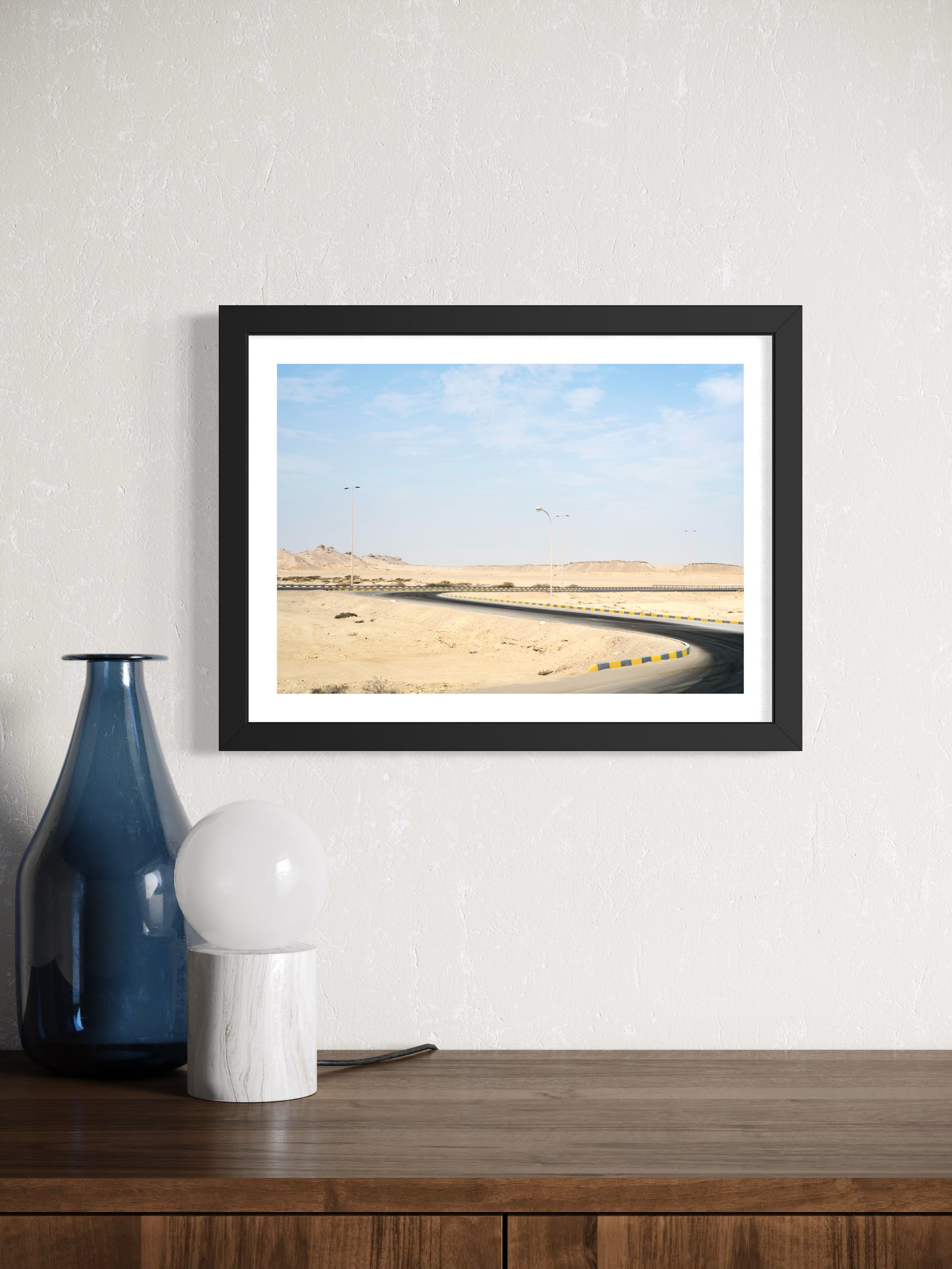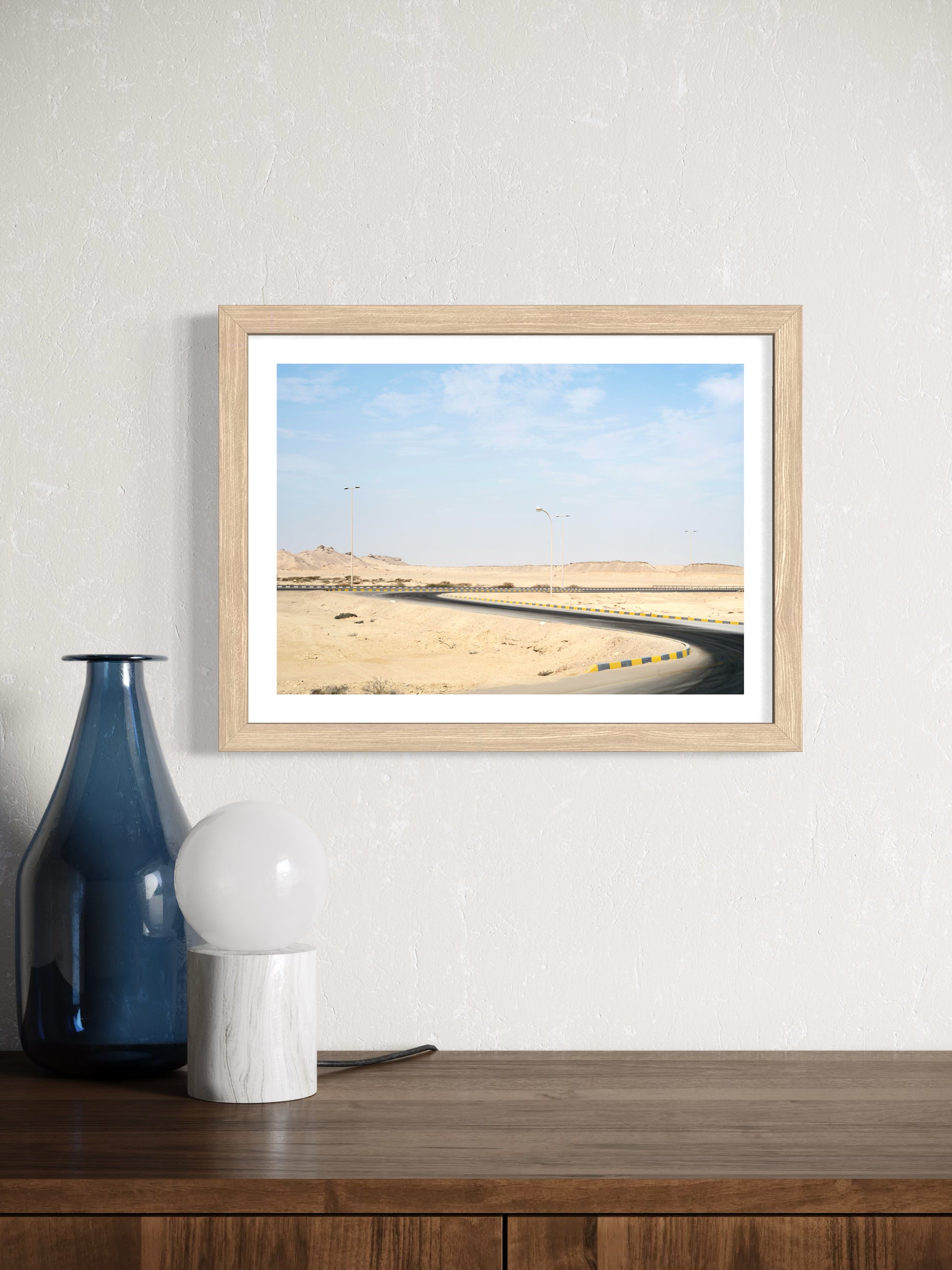 La route serpente et se fraie un chemin au milieu du paysage désertique, sous l’œil discret des lampadaires. Derrière son apparente tranquillité, cette œuvre témoigne de la lutte entre deux univers.