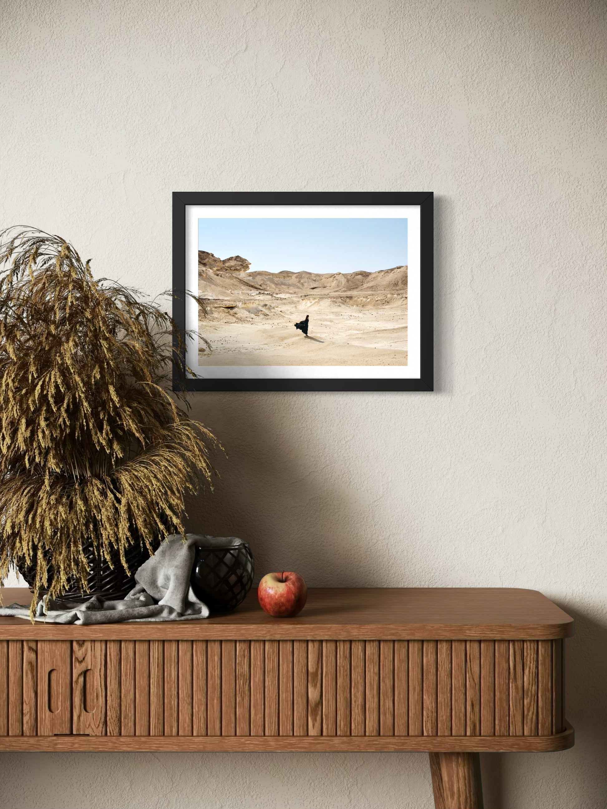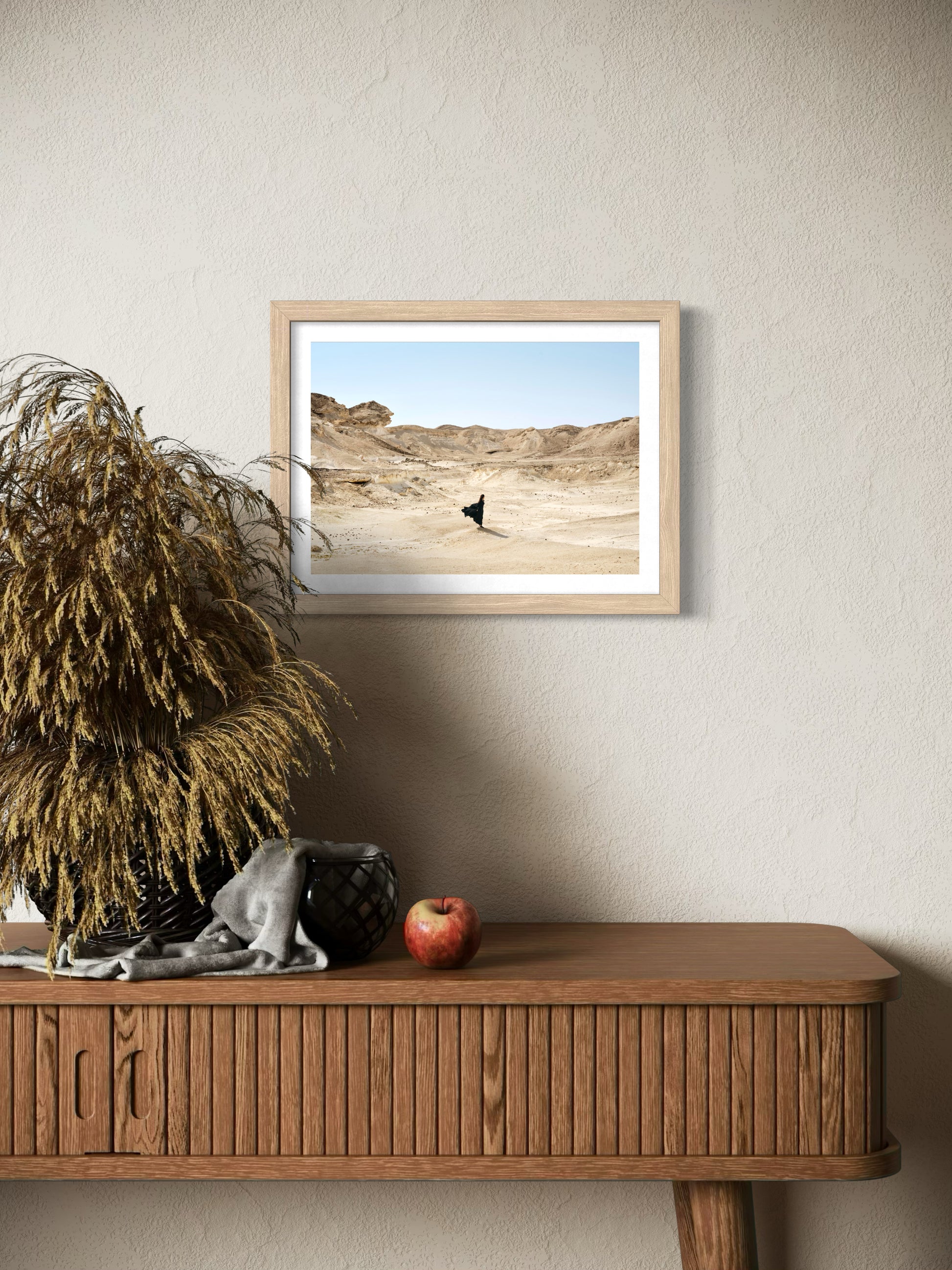 Ce lieu, l’un des premiers qu’elle a découvert en arrivant à Oman, l’a immédiatement frappée par sa force silencieuse. Un décor minéral, presque lunaire, traversé d’une lumière sèche et douce à la fois. Elle l’a observé, traversé, photographié encore et encore, cherchant la juste manière de le traduire. Longtemps vide, ce paysage semblait attendre une respiration humaine pour se révéler pleinement.